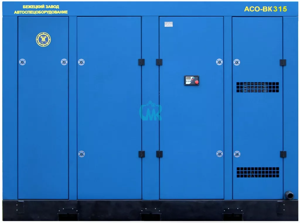 Стационарный винтовой компрессор АСО-ВК315/8 Бежецкого завода АСО имеет производительность 52 м3/мин при максимальном давлении 8 атм. Компрессор оснащен винтовым блоком SCA30G-R, электропривод имеет мощность 315 кВт. Уровень шума составляет 80-85 дБа. Температура воздуха на всасывании в диапазоне от 5 до 40°С, температура воздуха конечная (после газоохладителя) не более 50°С. Расход масла на унос, не более 11 г/час, содержание масла в сжатом воздухе, не более 3,5 мг/м3. Габариты установки составляют 350 х 240 х 255 см, масса 5500 кг.